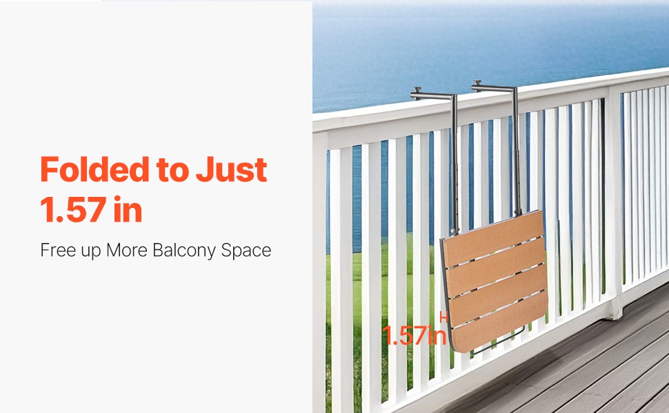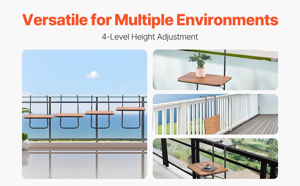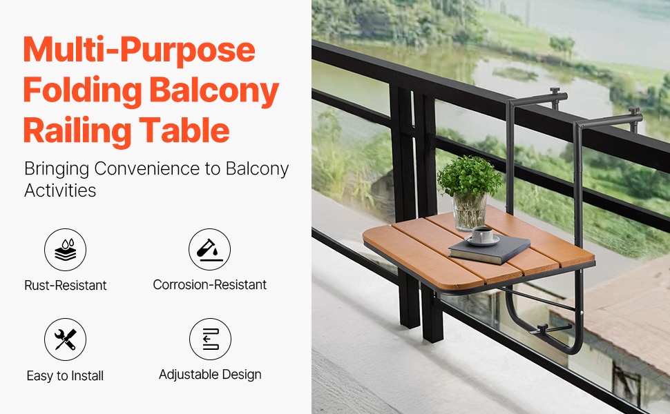 Tämä parvekekaiteeseen ripustettava pöytä tarjoaa käytännöllisen tason työskentelyyn, ruokailuun tai rentoutumiseen ulkotilassa. Taittuva rakenne säästää tilaa, ja korkeuden säätö auttaa mukauttamaan pöydän erilaisiin käyttötarkoituksiin ja kaidetyyppeihin.
