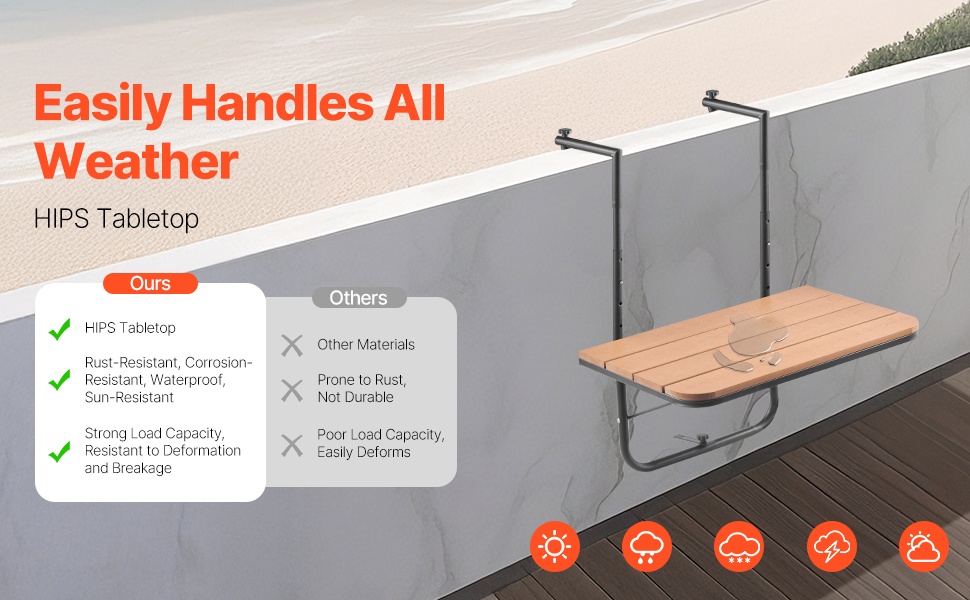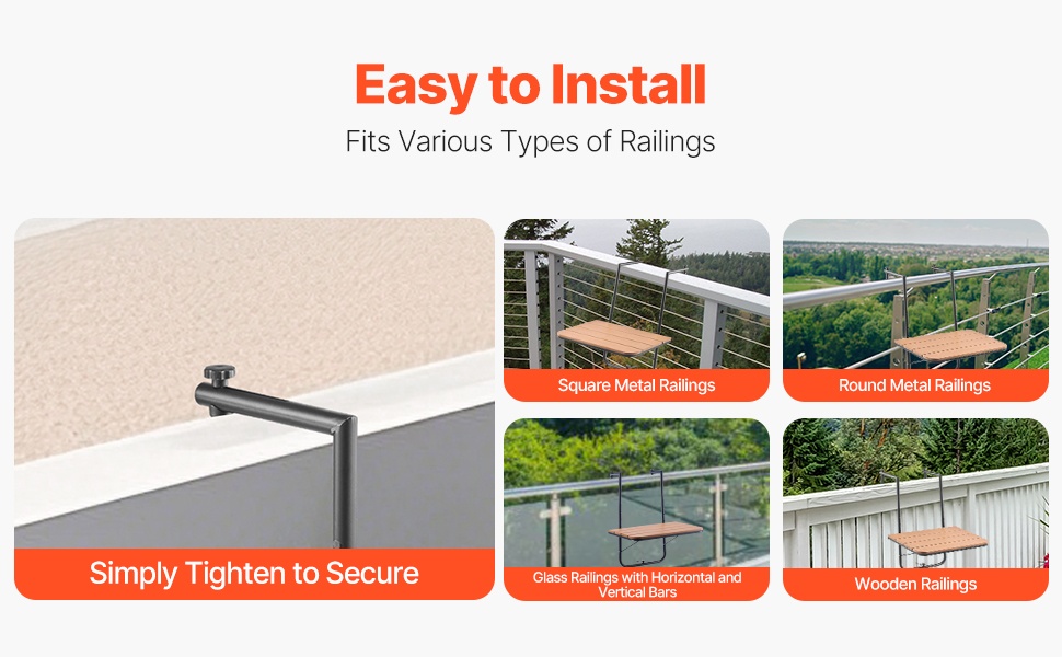 Pöydän kolmiorakenteinen kiinnitys ja ruostumattomasta teräksestä valmistettu, korroosiota kestävä tuki varmistavat vakauden ja estävät notkumisen pitkäaikaisessakin käytössä. Mukana tulevat tarvikkeet helpottavat asennusta, eikä kaiteen kulmaa tarvitse mitata erikseen – pöytä soveltuu erilaisille kaidetyypeille.