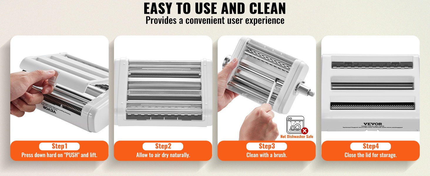 Lisäosa kiinnitetään suoraan yleiskoneeseen. Kun lisäosa on paikoillaan, säädä vain valitsinta ja aloita pastan valmistus. Mukana tuleva puhdistusharja helpottaa huoltoa. Pyyhi laitteen runko kuivalla liinalla tai harjalla. Rullan voi huuhdella vedellä ja kuivata sitten pehmeällä liinalla.