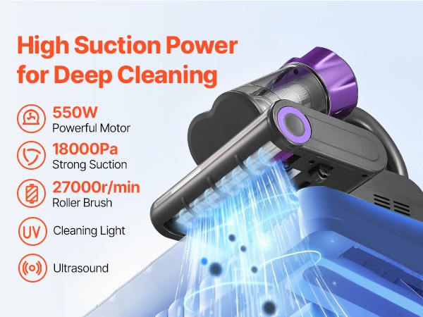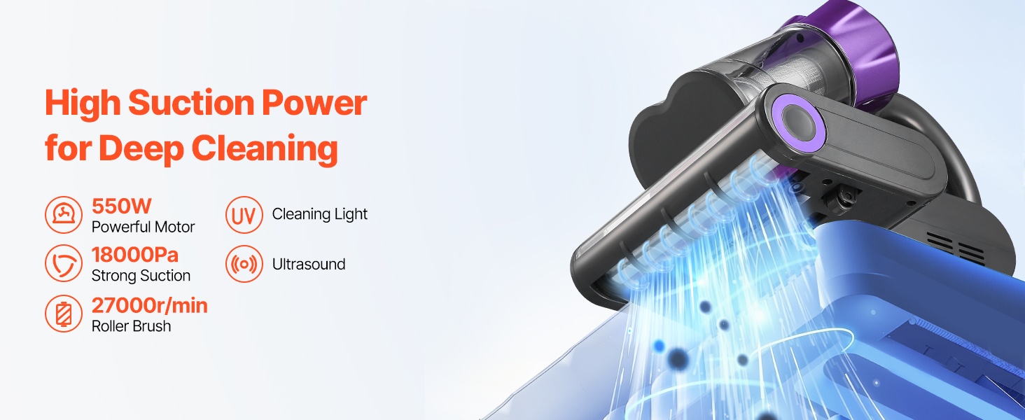 Jopa 18KPa imuteho ja 27,000 rpm nopeudella pyörivä rullaharja, yhdessä puhdistusvalon ja ultraäänitekniikan kanssa, auttavat irrottamaan ja imemään pölyn nopeasti kankaan sisältä.