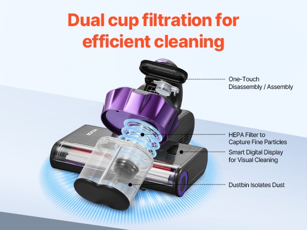 HEPA-suodatin vangitsee jopa 0.3 mikronin kokoiset hiukkaset, ja 650ml pölysäiliö kerää suuremmat pölymäärät erilleen. Usean tason suodatus varmistaa, että laitteesta tuleva ilma on puhdistettua.
