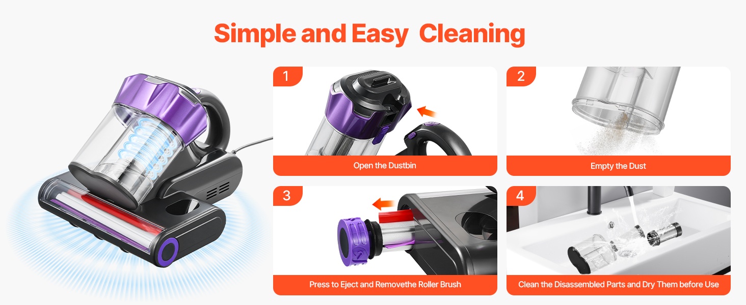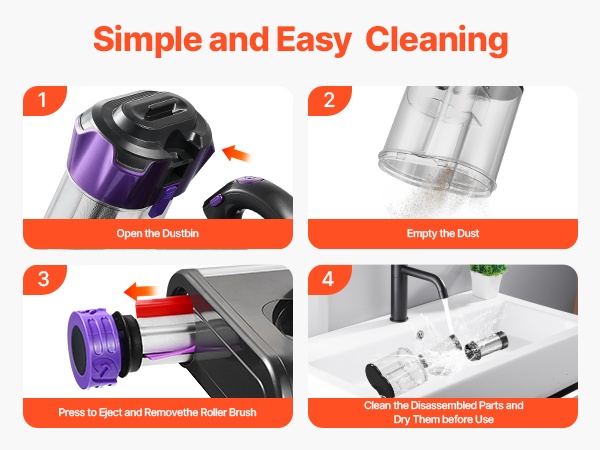 HEPA-suodatin, pölysäiliö ja rullaharja ovat irrotettavia ja pestäviä, joten puhdistus ja huolto ovat helppoja. Osat on hyvä puhdistaa käytön jälkeen ja antaa kuivua kunnolla ennen seuraavaa käyttökertaa.