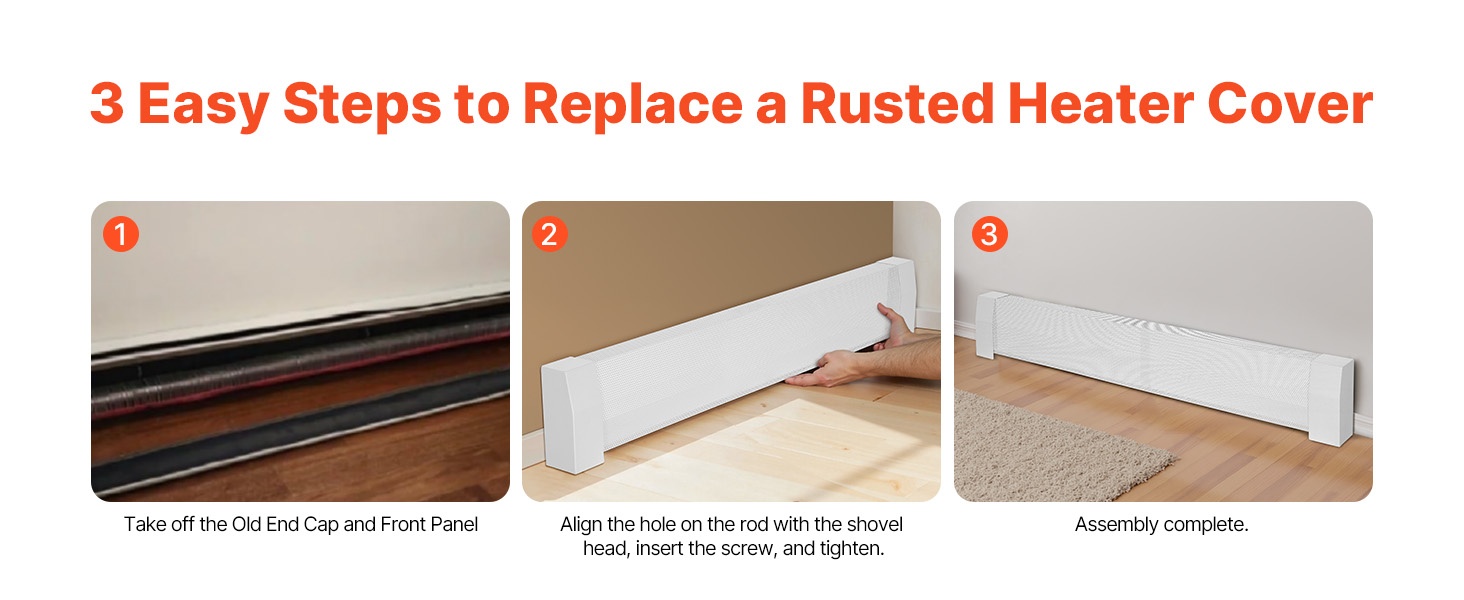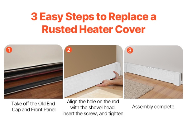 Vanhan, ruostuneen jalkalistapatterin suojuksen voi vaihtaa tähän malliin vain kolmessa yksinkertaisessa vaiheessa. Erikoistyökaluja ei tarvita, joten asennus sopii myös aloittelijoille.