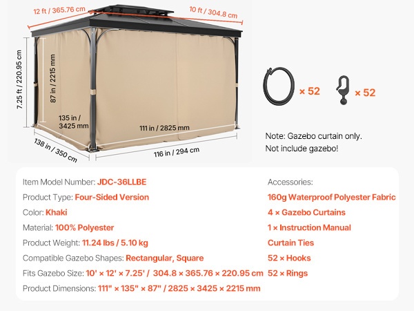 - Pakkaus: vain verhosarja, ei sisällä paviljongin runkoa tai katosta