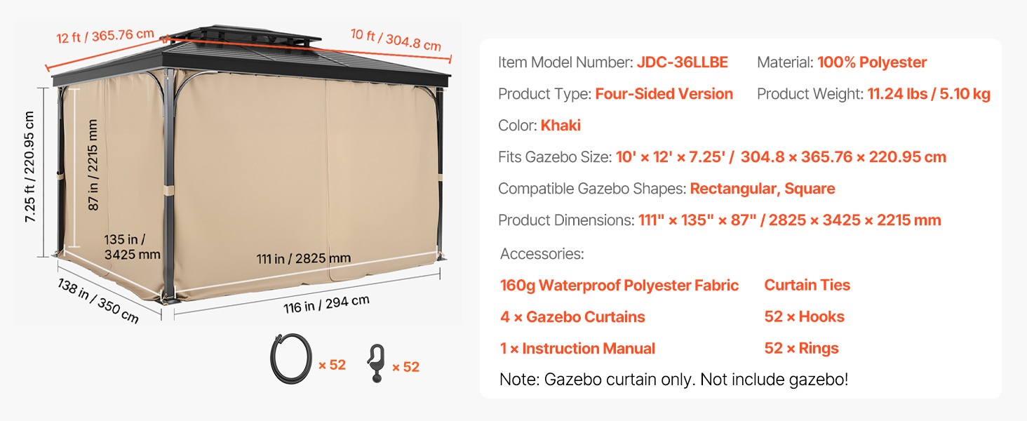 Verho on suunniteltu 10' x 13' x 7' paviljonkeihin. 160gsm vedenpitävä 100 % polyesterikangas tarjoaa suojan auringolta ja kevyeltä sateelta. Kaksipuolinen vetoketju mahdollistaa helpon säätämisen, ja alumiiniset purjerenkaat sekä kolmisektiomainen nauha varmistavat nopean asennuksen ja vakaan tuen yksityisyyden lisäämiseksi.