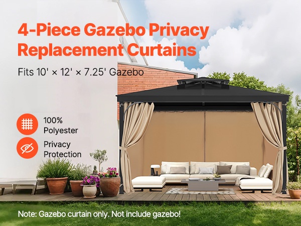 Tämä 10' x 13' x 7' (281 x 373 x 213 cm) paviljonkeihin sopiva sivuverhosarja koostuu neljästä paneelista, jotka tarjoavat yksityisyyttä ja suojaa ulkotilaan. Verhot ovat valmistettu 160gsm vedenpitävästä 100 % polyesteristä ja ne on helppo kiinnittää ja avata vetoketjujen avulla.