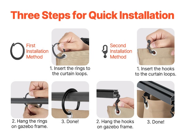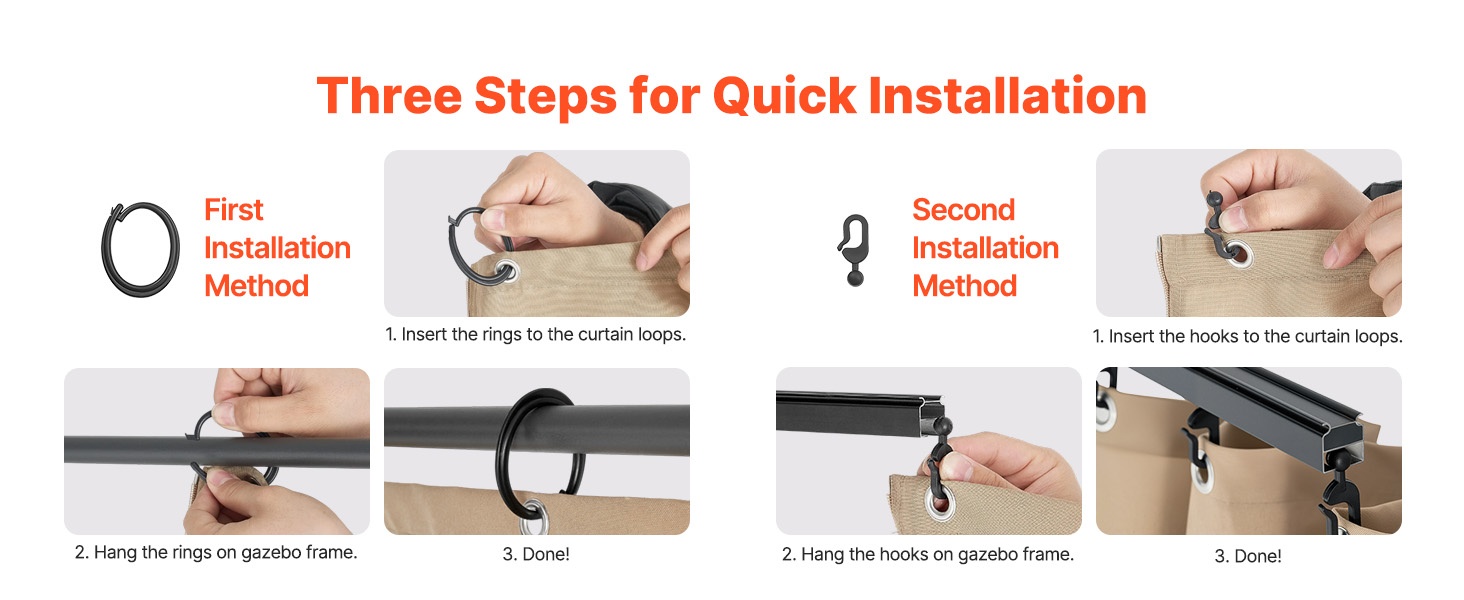Voit valita paviljonkiisi sopivan ripustustavan ja viimeistellä ulkotilan ilmeen sekä toiminnallisuuden. Purjerenkaat ja nauhat helpottavat verhojen asentamista erilaisiin runkorakenteisiin.
