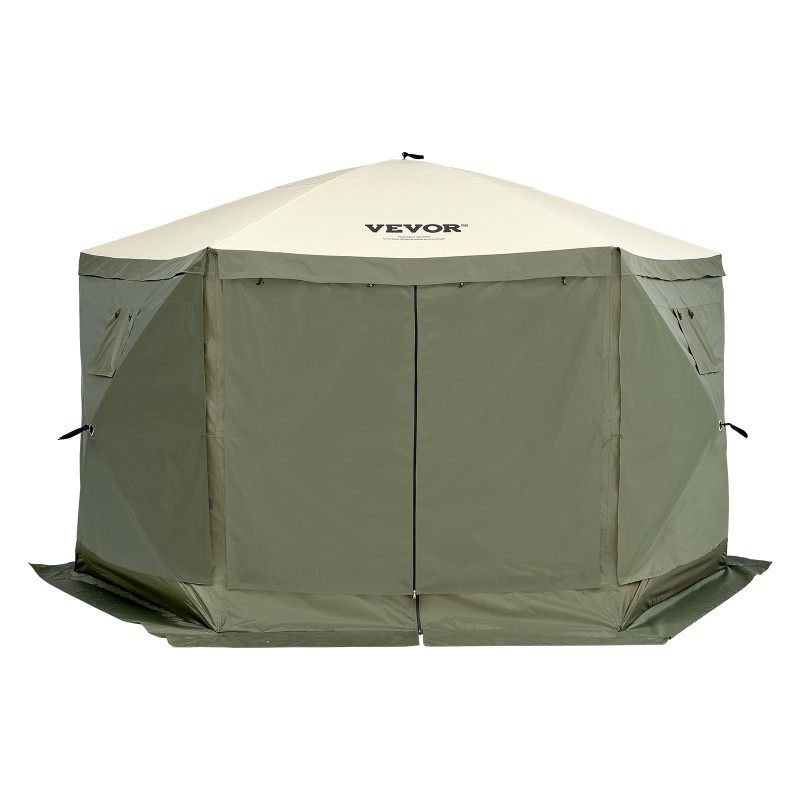 Tämä 6-sivuinen pop up -paviljonki tarjoaa suojaisan oleskelutilan ulkoiluun. 12 x 12 jalkaa (3.66 x 3.66 m) kokoinen teltta sopii jopa 8 henkilölle ja sen alle mahtuu hyvin tuoleja ja muuta leirikalustoa.