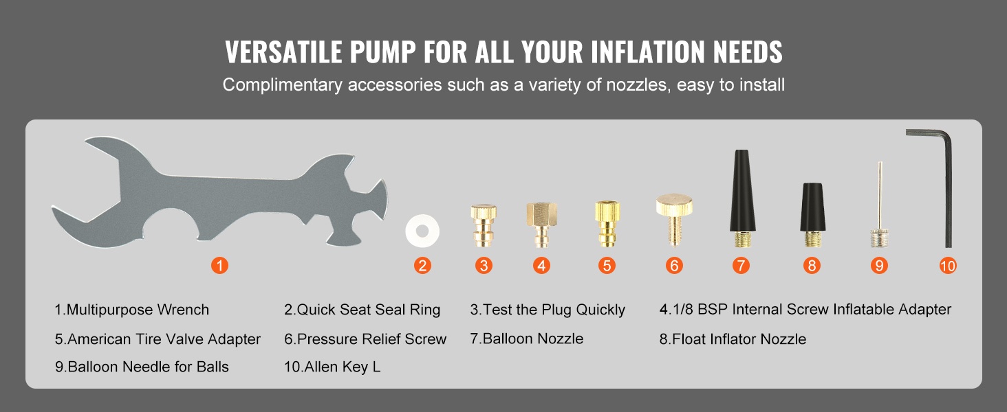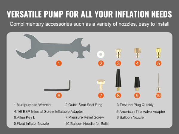 Pumppu toimitetaan useiden eri suuttimien kanssa, joten sillä voi täyttää ilmakiväärien lisäksi autonrenkaita, polkupyöränrenkaita, kajakkeja ja erilaisia palloja. Yksi laite kattaa useita täyttötarpeita.