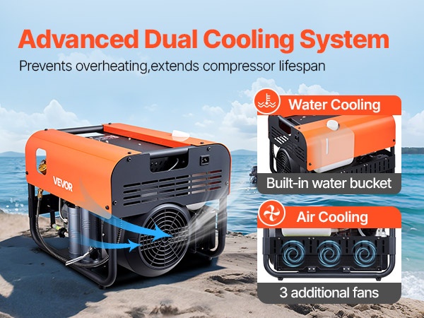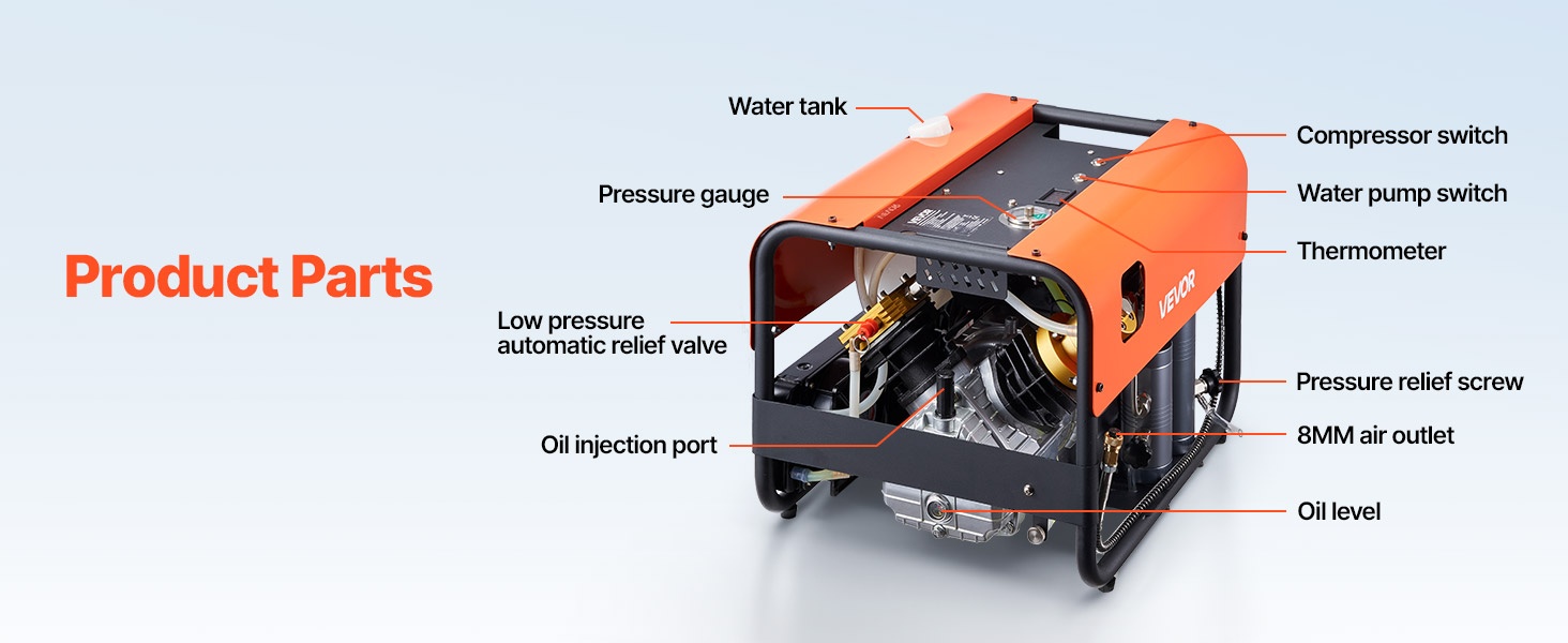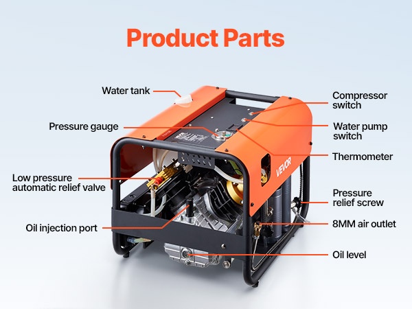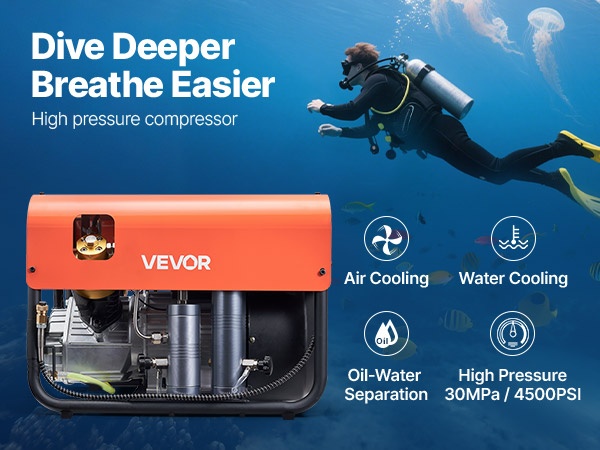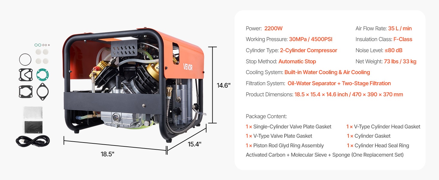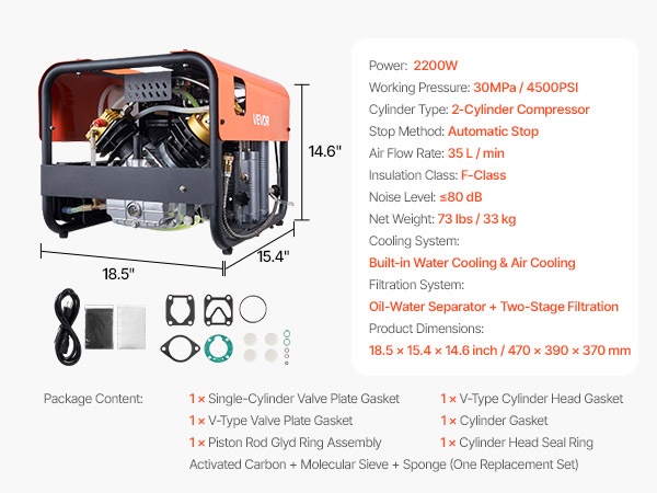 Tämä nelisylinterinen paineilmakompressori tuottaa tehon 1500W ja enimmäispaineen 4500PSI (30MPa), sekä ilmavirran 60 L/min. Kun asetettu paine saavutetaan, kompressori pysähtyy automaattisesti, mikä mahdollistaa turvallisen täytön esimerkiksi paintball-aseille, PCP-ilmakivääreille ja sukelluspulloille.