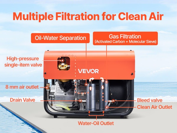 Monikerroksinen suodatusjärjestelmä varmistaa puhtaan, kuivan ja korkealaatuisen paineilman. Paintball-kompressoriin kuuluu öljy-vesierotin sekä kaasusuodatusjärjestelmä (aktiivihiili + molekyyliseula), jotka poistavat tehokkaasti kosteuden, öljyn ja epäpuhtaudet.