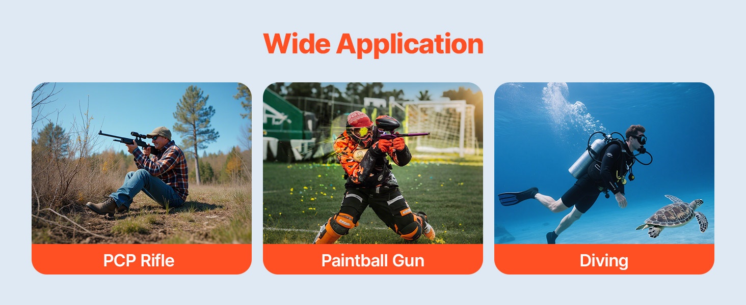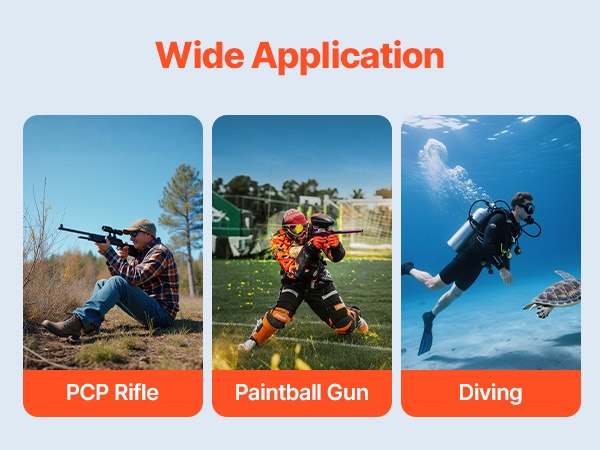 Korkeapainetoiminen 4500PSI PCP-kompressori soveltuu hyvin sukelluspulloille, PCP-ilmakivääreille, paintball-aseille, palontorjuntaan, vuotojen etsintään, painetesteihin ja moniin muihin käyttökohteisiin, joissa tarvitaan suuria paineita.