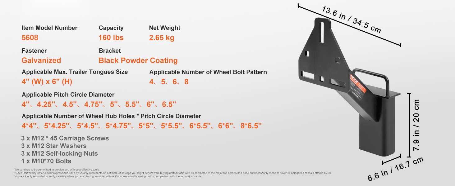 Tämä vararengasteline sopii vanteille, joissa on 4, 5, 6 tai 8 pultinreikää. Jaolliset halkaisijat (pitch circle diameter) ovat 4", 4.25", 4.5", 4.75", 5", 5.5", 6" ja 6.5", joten teline kattaa monia yleisiä perävaunumalleja.