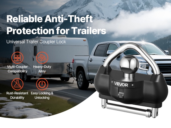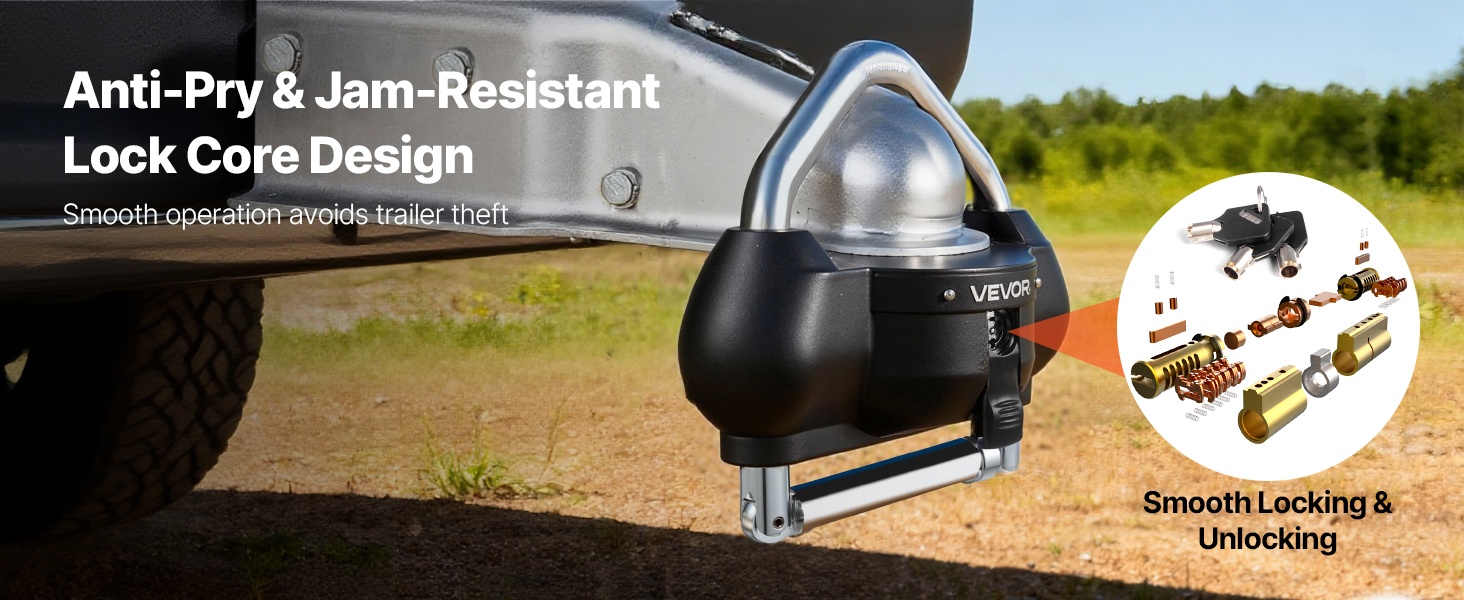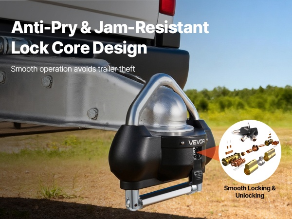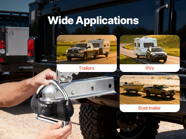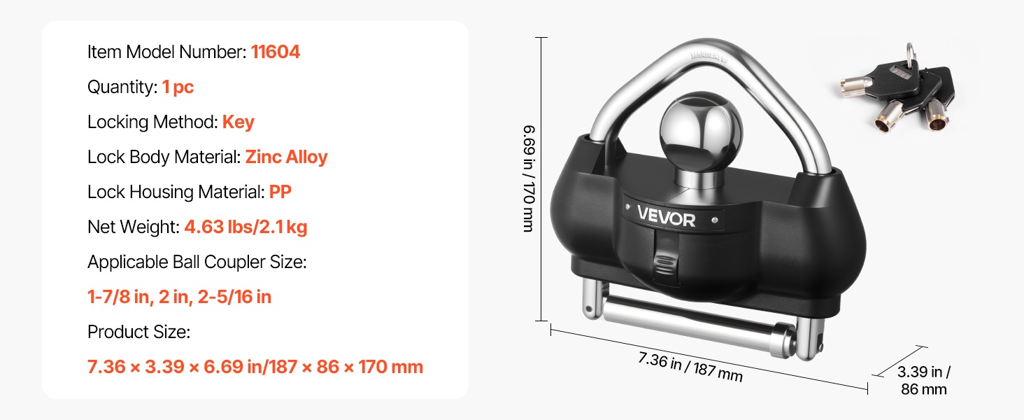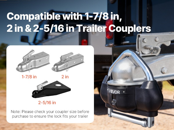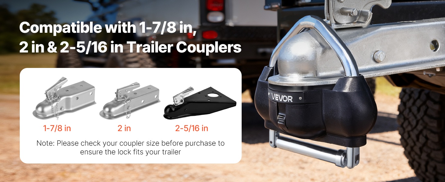 Lukko sopii vetokytkimiin, joiden kuulakoko on 1-7/8 tuumaa, 2 tuumaa tai 2-5/16 tuumaa. Näin se kattaa suuren osan matkailuvaunujen, perävaunujen ja venevaunujen yleisistä mitoituksista. Tarkista vetokytkimesi koko ennen ostoa varmistaaksesi yhteensopivuuden.