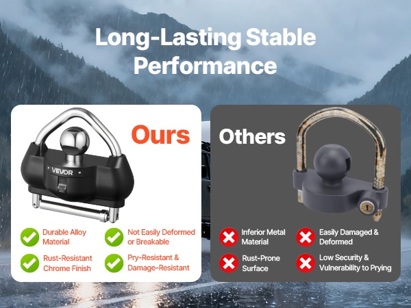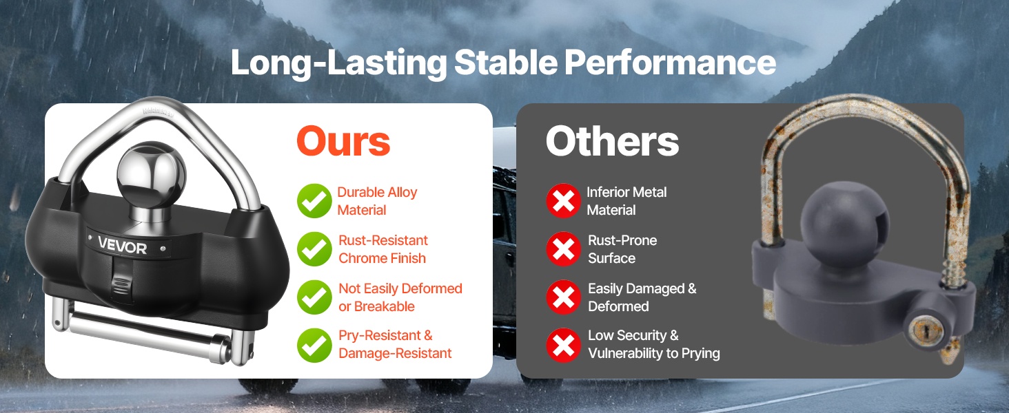 Raskasrakenteinen sinkkiseosrunko kestää muodonmuutoksia ja murtumista. Kromattu pinta suojaa ruostumiselta ja korroosiolta, joten lukko soveltuu ympärivuotiseen käyttöön. Luja rakenne auttaa ehkäisemään vääntöä ja iskuja ja pitää perävaunun paremmin turvassa.