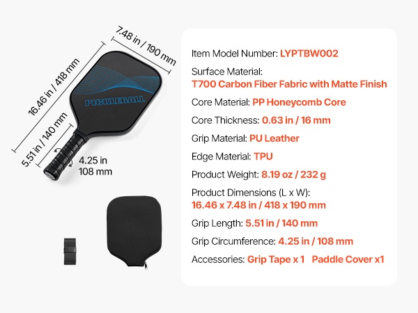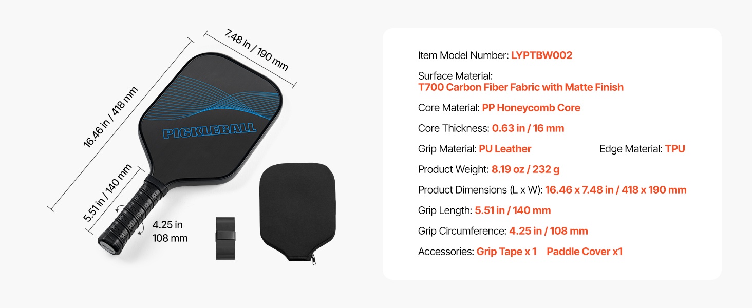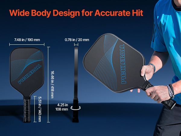 Pickleball-maila T700-hiilikuitupinta PP-hunajakennoinen ydin PU-kahva leveä lapa