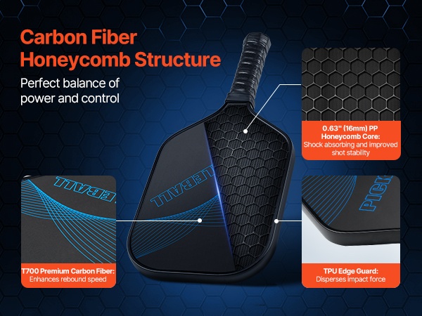 Mailan lyöntipinta on valmistettu T700-hiilikuitukankaasta, joka tukee pallon kimpoamisnopeutta ja auttaa tuottamaan kierrettä. PP-hunajakennoinen ydin vaimentaa iskuja ja vähentää tärinää, mikä tekee lyönneistä vakaampia. TPU-reunus suojaa mailan reunaa ja jakaa iskukuormaa.