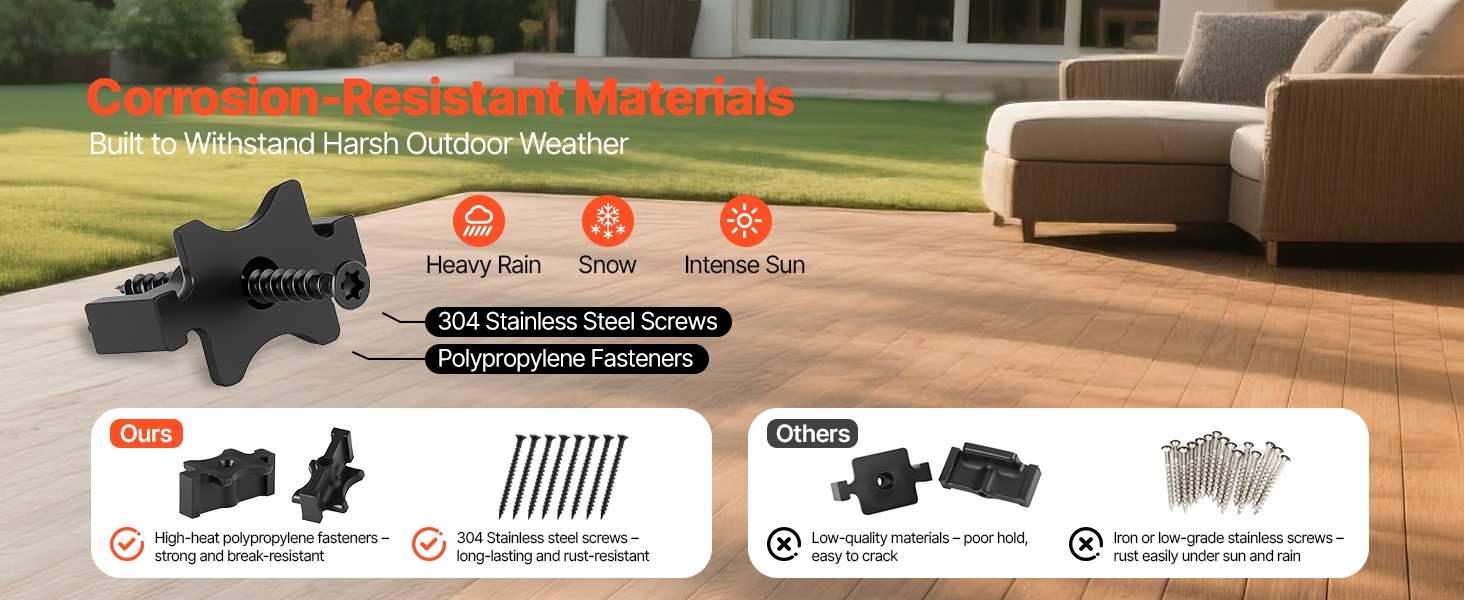 Pakkaukseen sisältyvät yksityiskohtaiset ohjeet helpottavat asennusta. Kiinnikkeet auttavat pitämään terassilaudat tukevasti paikoillaan ja vähentävät liikkumisen tai vääntymisen riskiä ajan myötä.