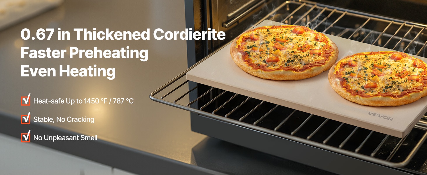 Pizzakivi on valmistettu paksusta kordieriitista, joka kestää jopa 1450 °F/787 °C lämpötilan. Materiaali varaa lämmön pitkäksi aikaa ja jakaa sen tasaisesti, mikä ehkäisee vetelän pohjan ja paikallisesti palaneet kohdat ja tukee tasalaatuista paistotulosta.