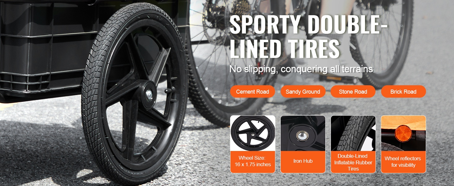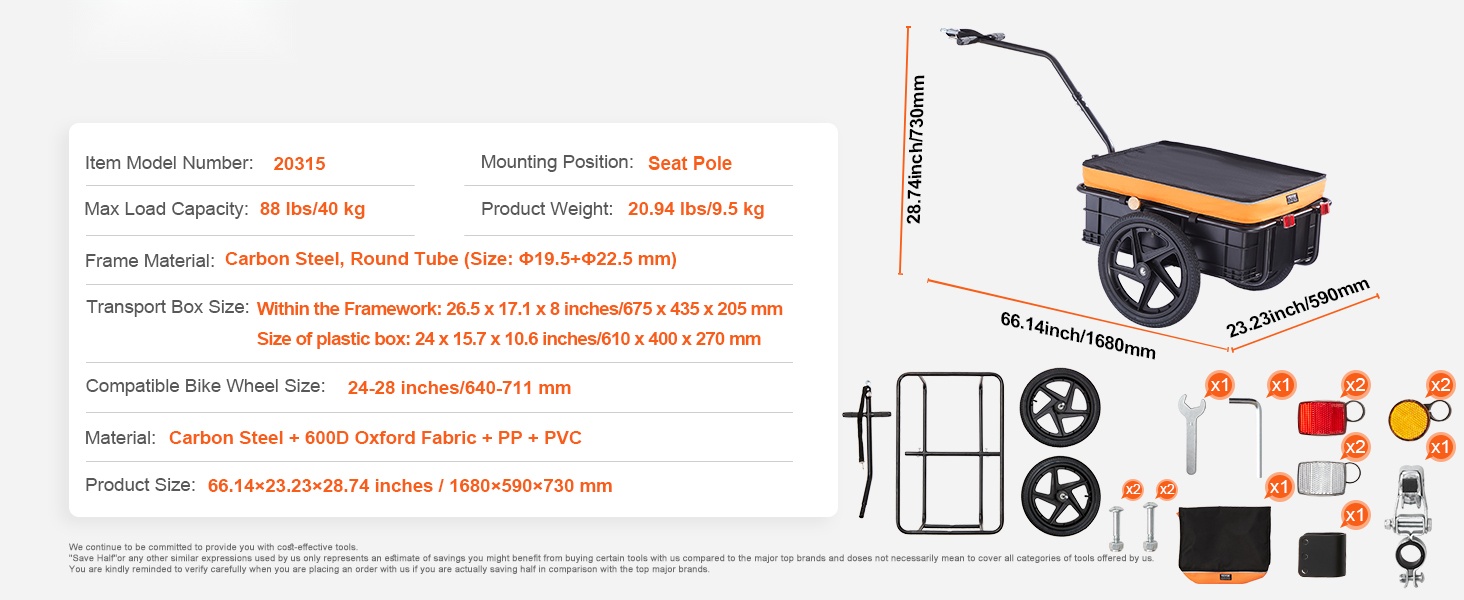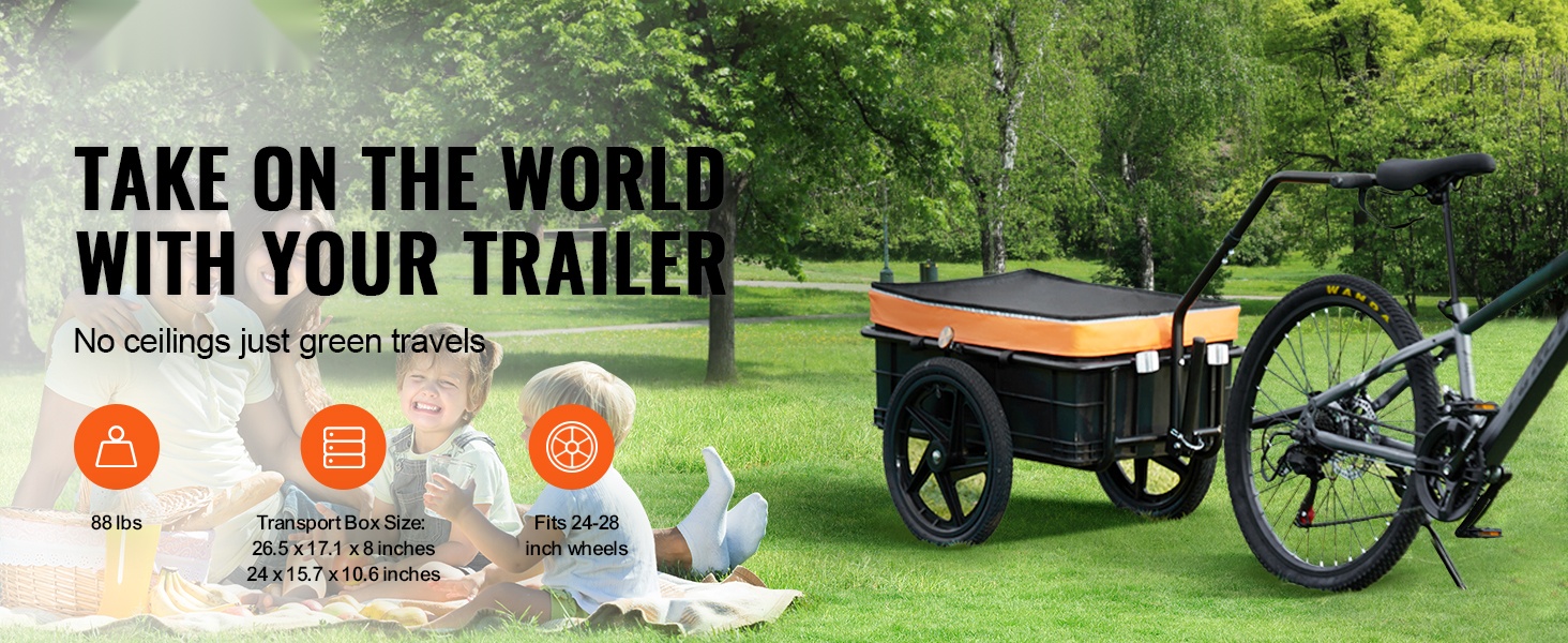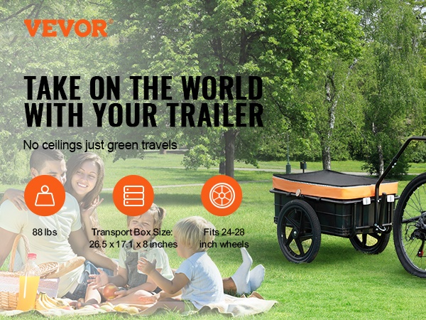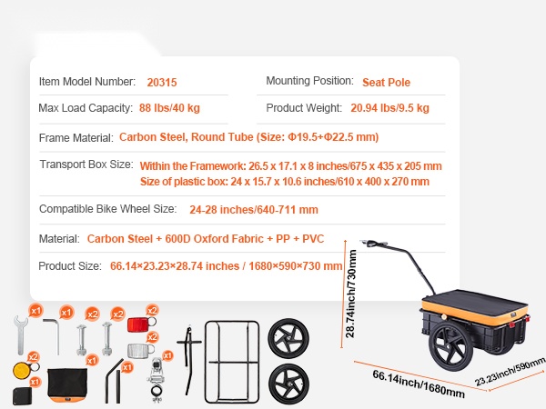 Tämä polkupyörän tavaraperäkärry kuljettaa jopa 70 lbs/32 kg kuormaa. Tilava laatikko sopii esimerkiksi retkivarusteille, ostoksille tai työkaluille. Peräkärry sopii useimpiin polkupyöriin, joten sitä on helppo käyttää sekä arjessa että vapaa-ajalla.