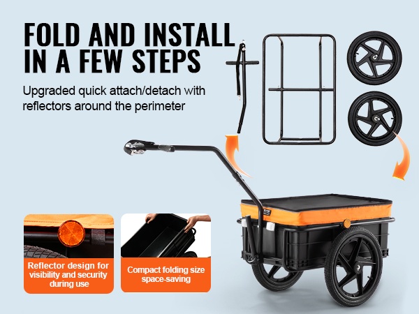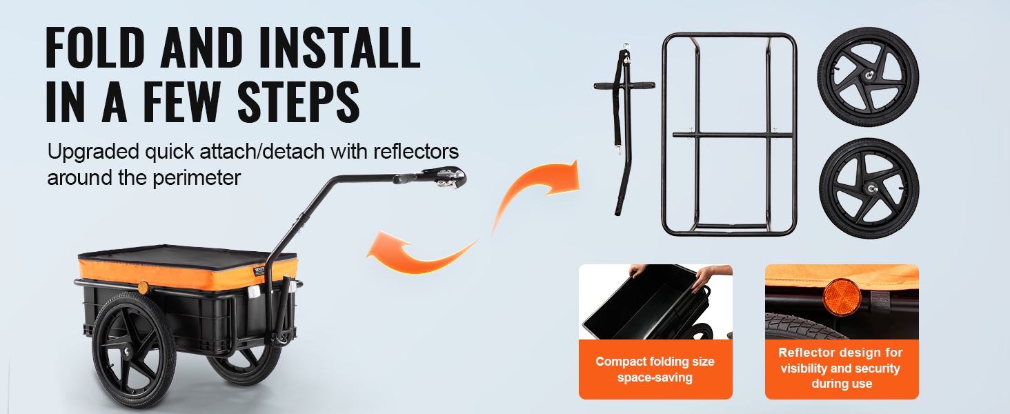 Pikakiinnitysjärjestelmä tekee asennuksesta ja irrotuksesta nopeaa. Kun peräkärryä ei tarvita, sen saa helposti irti ja talteen pieneen tilaan. Mukana olevat heijastintarrat lisäävät näkyvyyttä ja tuovat samalla pientä viimeisteltyä ilmettä.