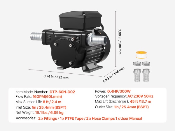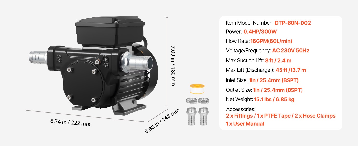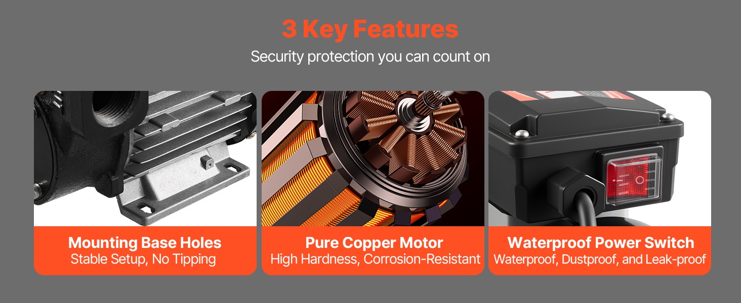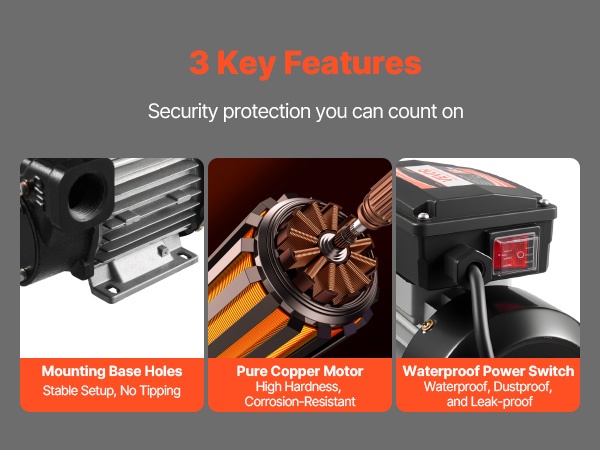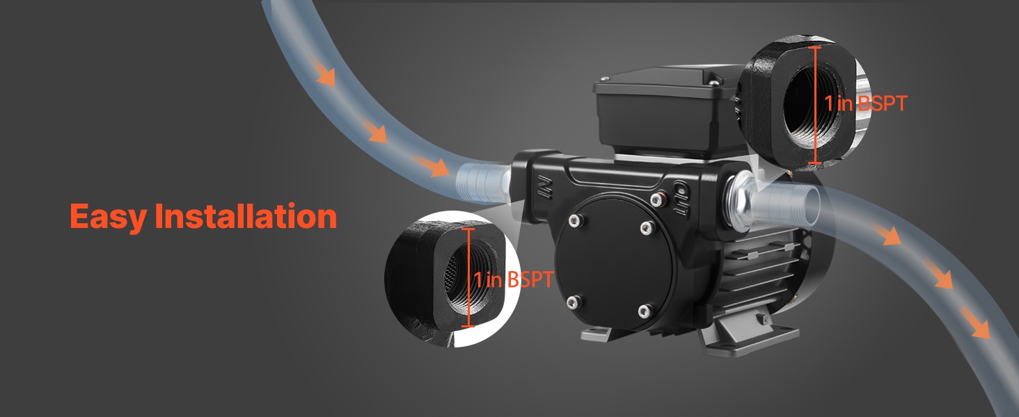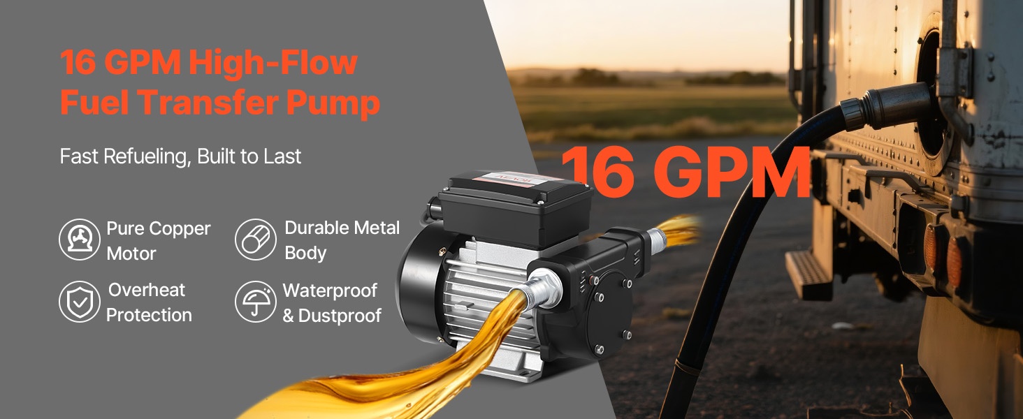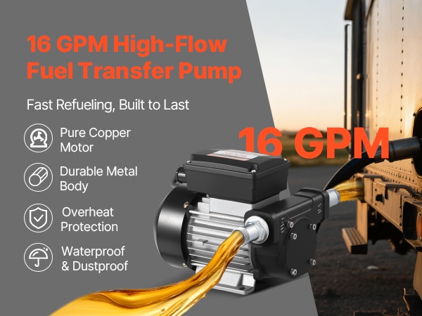 Tehokas polttoaineensiirtopumppu nopeaan tankkaukseen: virtausnopeus enintään 15 GPM (57 L/min), enimmäisimukorkeus 37 ft (11.28 m) ja enimmäisimukorkeus 8 ft (2.4 m). Puhdas kuparimoottori, valurautainen pumppupää ja sisäänrakennettu ylikuumenemissuoja tarjoavat luotettavan ja turvallisen käytön dieselille, petroolille ja biodieselille.