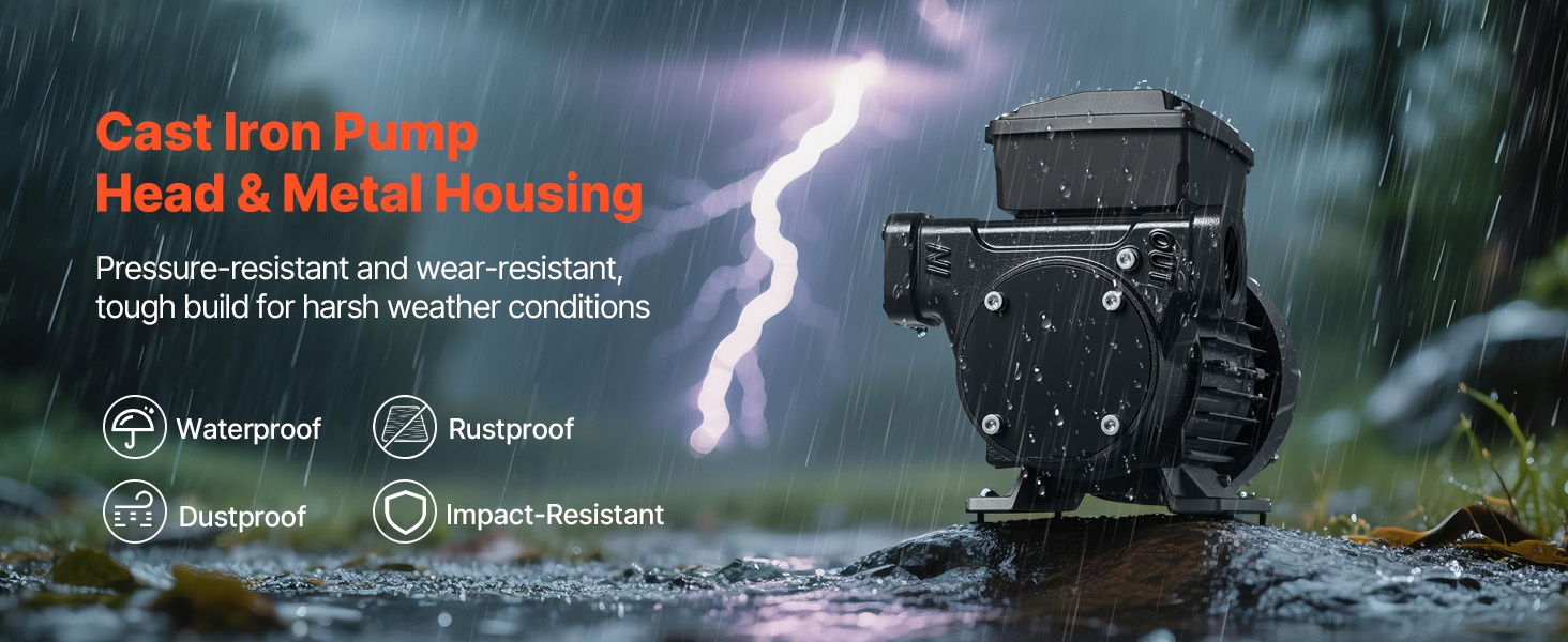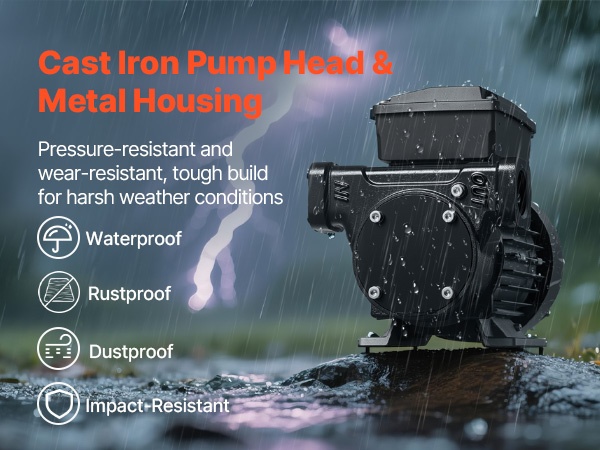 Pumppu on valmistettu lujasta valuraudasta, joka kestää painetta, kulutusta ja korroosiota. Rakenne on vesitiivis, pölytiivis ja iskunkestävä, joten pumppu soveltuu vaativiin ulko-olosuhteisiin ruostumatta, vääntymättä tai ylikuumentumatta, ja tarjoaa pitkäaikaista käyttövarmuutta.