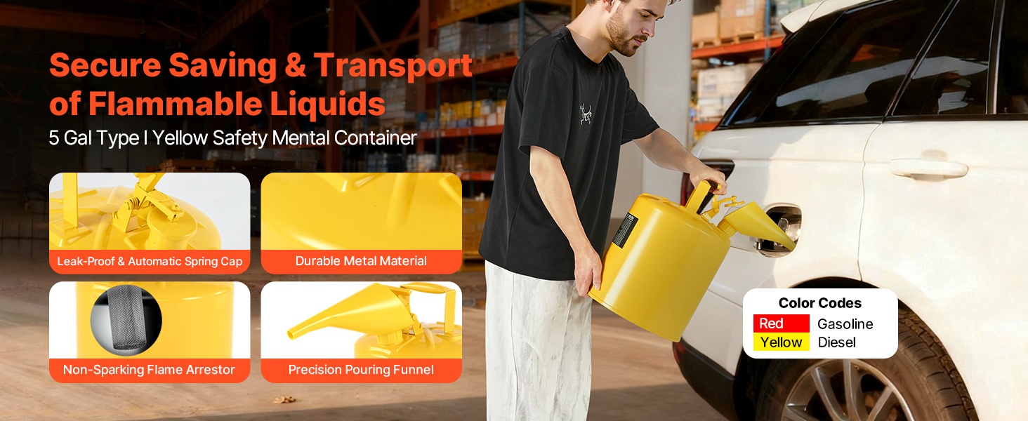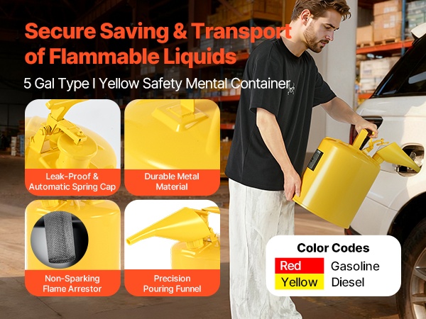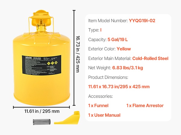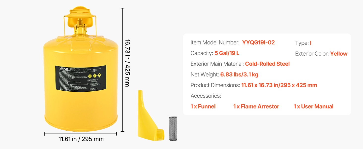 Tämän Tyyppi I -turvakanisterin tilavuus on 5 gal / 19 L, ja se on suunniteltu bensiinin ja muiden helposti syttyvien polttoaineiden turvalliseen säilytykseen ja kaatamiseen. Jousikuormitteinen, itsestään sulkeutuva kansi vähentää vuotojen ja roiskeiden riskiä, ja mukana tuleva suppilo helpottaa tarkkaa täyttöä.