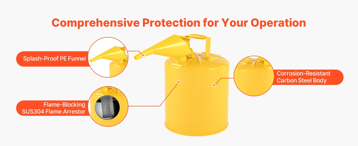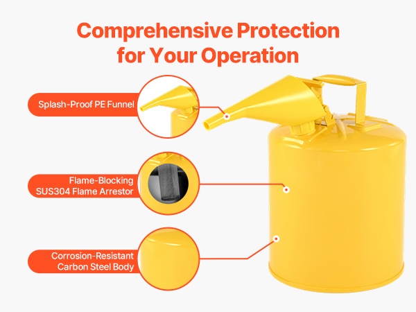 Vahva, korroosionkestävä hiiliteräsrunko ja SUS304-liekinsammutin auttavat estämään ulkoisten liekkien pääsyn kanisterin sisään ja vähentävät nesteiden syttymisriskiä. Roiskeita ehkäisevä PE-suppilo ja leveä suuaukko tekevät täyttämisestä ja kaatamisesta hallittua ja sujuvaa.