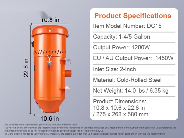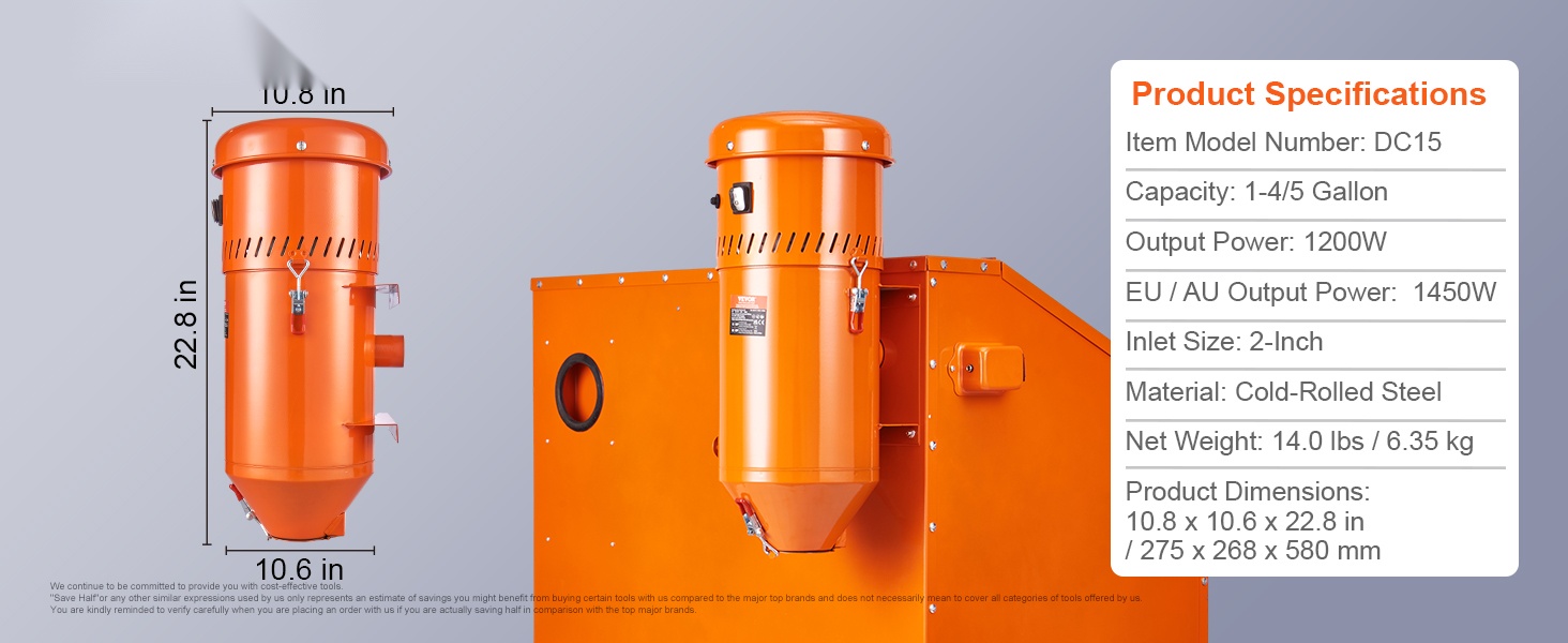 - 6.8 L / 1.8 gallonan säiliö kapasiteetin riittävään pölyn ja materiaalin talteenottoon