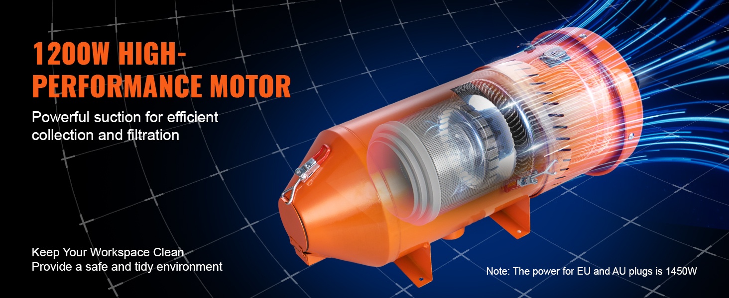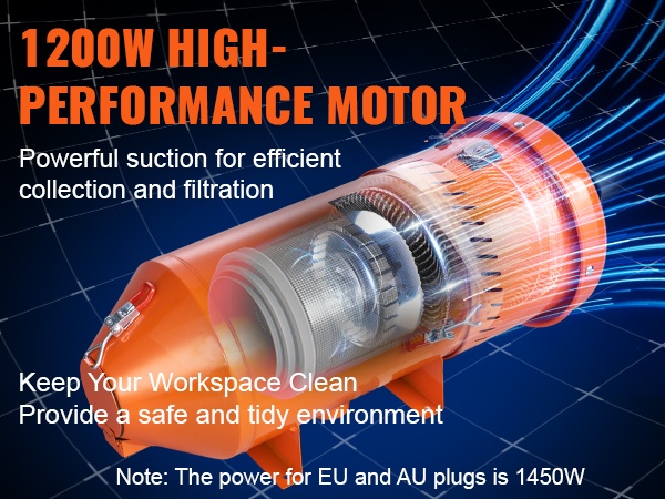 Vahva 1450W moottori tuottaa hyvän imutehon ja auttaa poistamaan pölyn hiekkapuhalluskaapista nopeasti. Tehokas suodatus parantaa näkyvyyttä kaapin sisällä ja vähentää hienopölyn leviämistä ympäristöön.