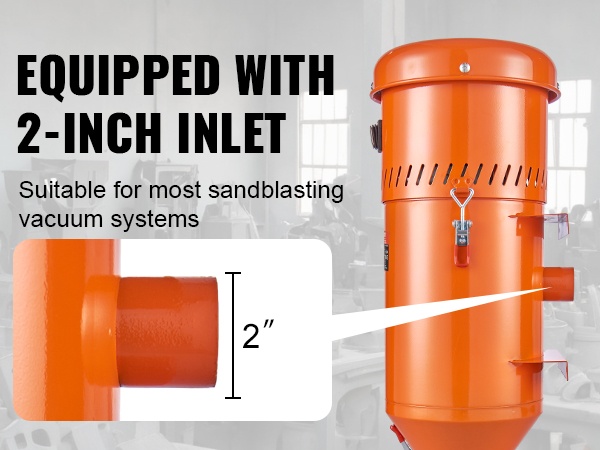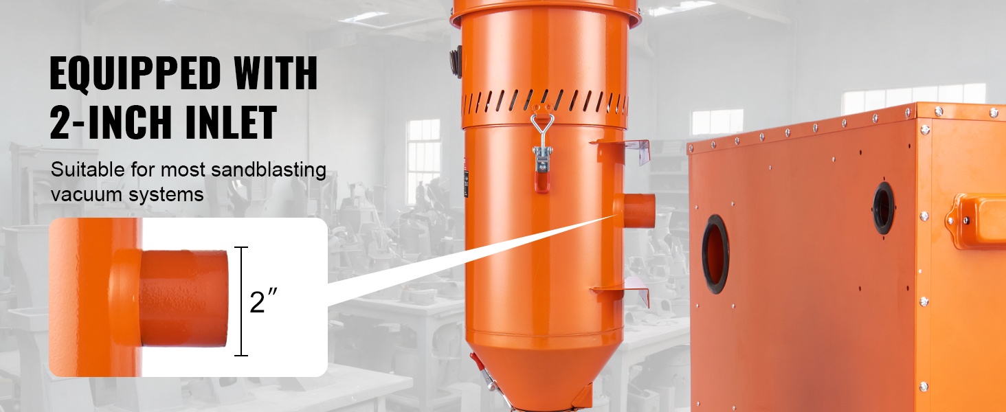 - 2-tuumainen sisääntulo, joka sopii useimpiin hiekkapuhalluskaappeihin ja imujärjestelmiin
