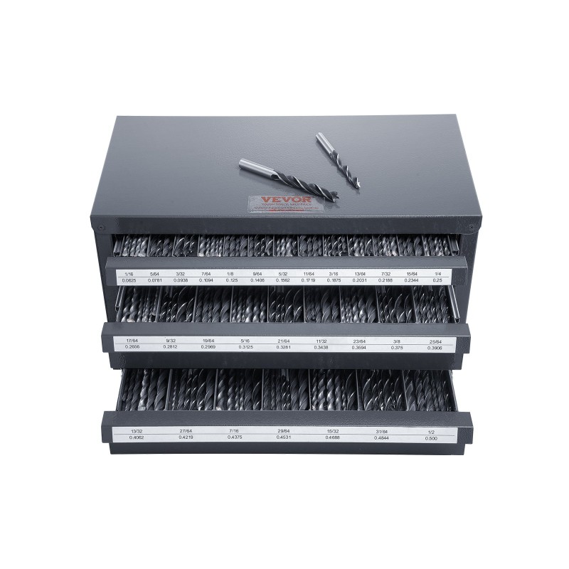 Tämä kolmilaatikkoinen poranterien säilytyskaappi auttaa pitämään poranterät selkeästi järjestyksessä. Kaapissa on yhteensä 29 lokeroa poranterille kokovälillä 1/16"–1/2" (noin 1.59 mm–12.7 mm), jolloin eri koot löytyvät nopeasti ja pysyvät hyvin suojattuina.