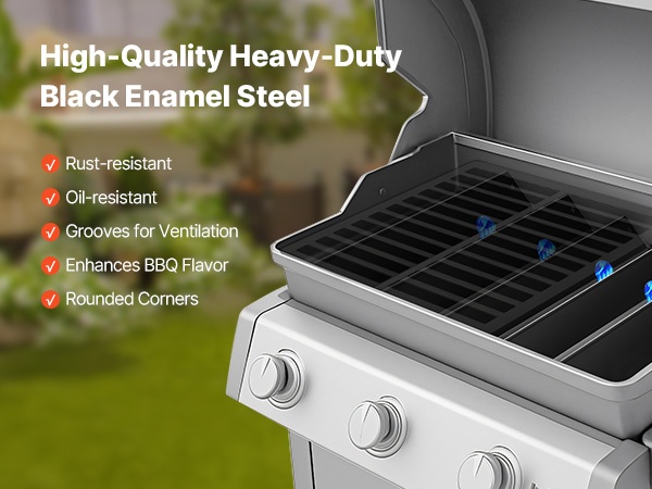 Flavorizer-tangot ja lämmönjakolevyt on valmistettu raskaasta, mustasta posliiniemaloidusta teräksestä, joka tarjoaa pitkän käyttöiän, hyvän korroosionkeston ja helpon puhdistettavuuden. Kestävä rakenne vähentää huollon tarvetta ja pidentää grillin käyttöikää.