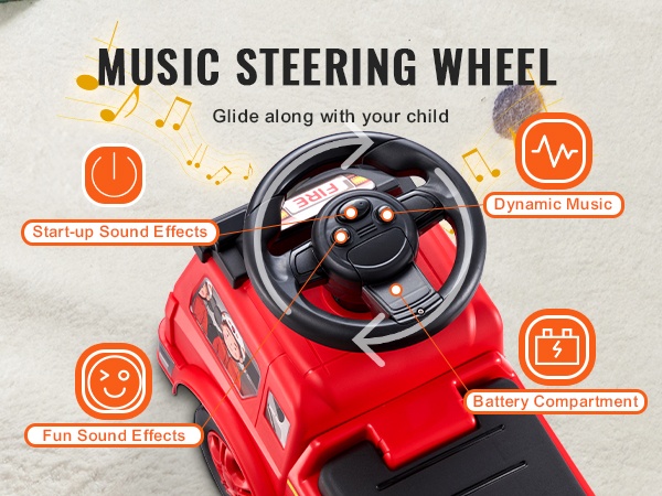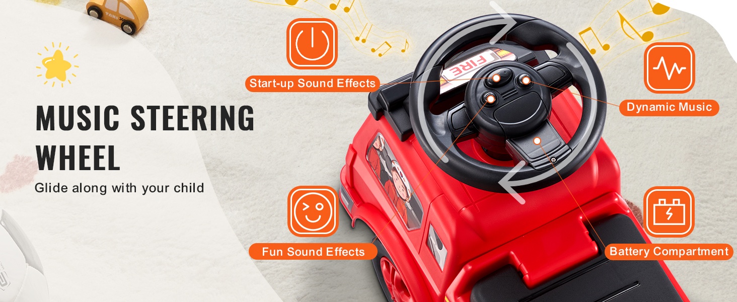 Ohjauspyörässä on musiikkipainike, josta kuuluu iloisia sävelmiä ajon aikana. Viimeistelty, sileä pinta ilman teräviä reunoja auttaa suojaamaan lapsen herkkää ihoa naarmuilta.