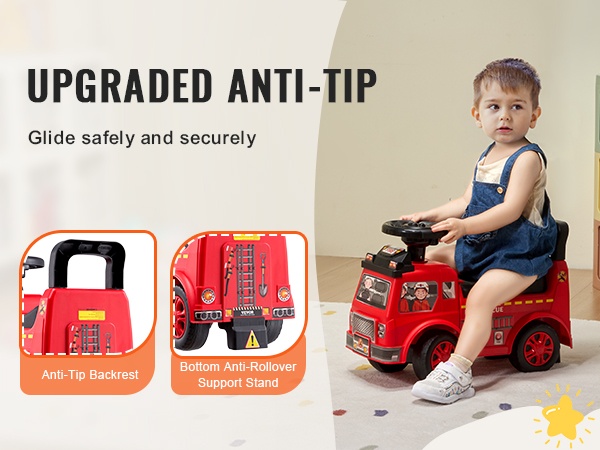 Potkuautossa on selkänoja ja kaatumista estävä tukitanko takana, jotka vähentävät kaatumisriskiä ja tukevat lasta leikin aikana.