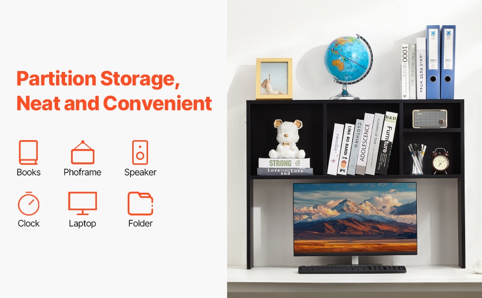Useat eri lokero- ja hyllytilat helpottavat kirjojen, toimistotarvikkeiden ja pienten esineiden järjestämistä. Näin työpöydästä tulee selkeämpi ja työskentely keskittyneempää. Hylly on valmistettu lastulevystä, jonka pinta on sileä, vedenkestävä ja naarmuuntumista kestävä, ja se on helppo pyyhkiä puhtaaksi. Käyttöä tukevat myös liukumattomat jalkatyynyt ja kaatumisen estoon tarkoitetut tarvikkeet.