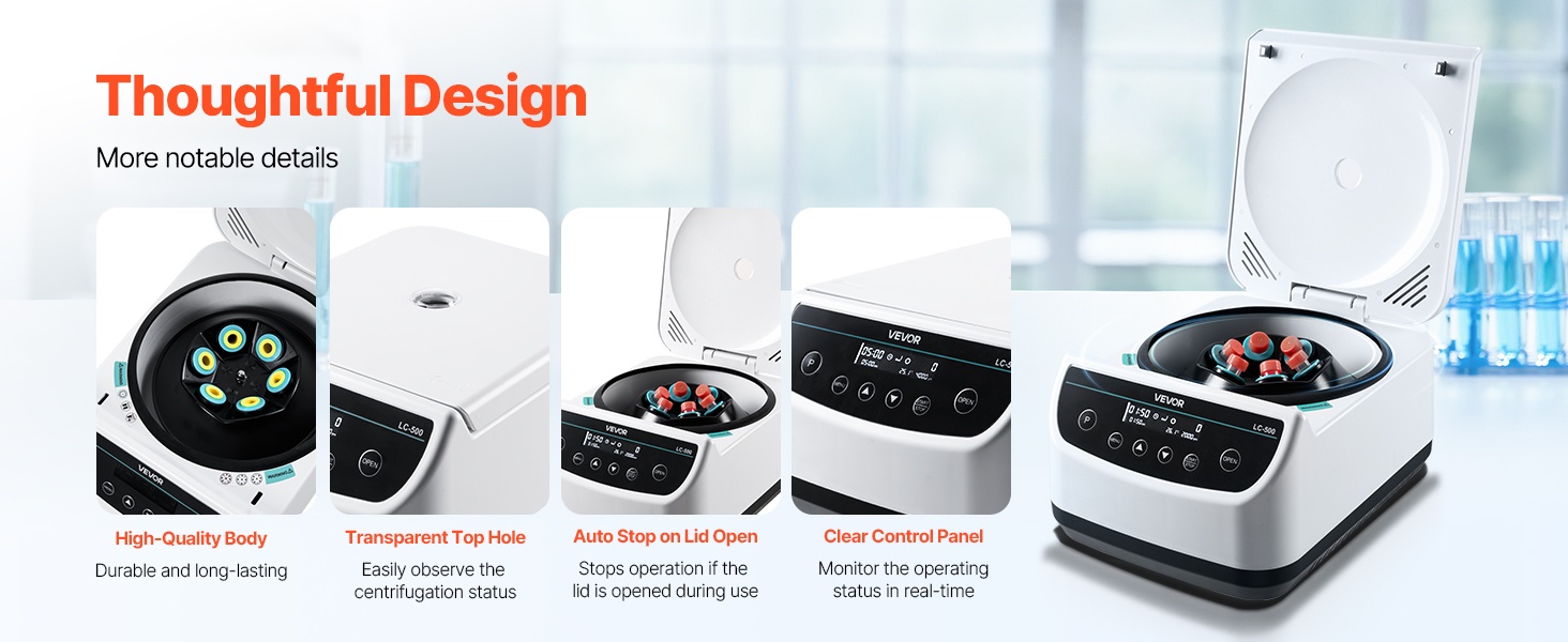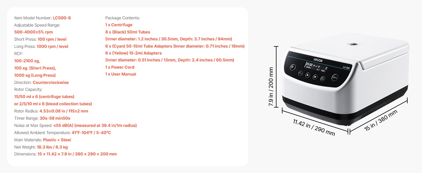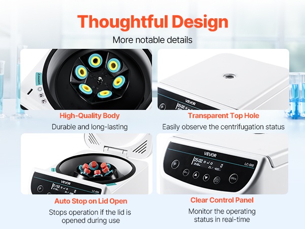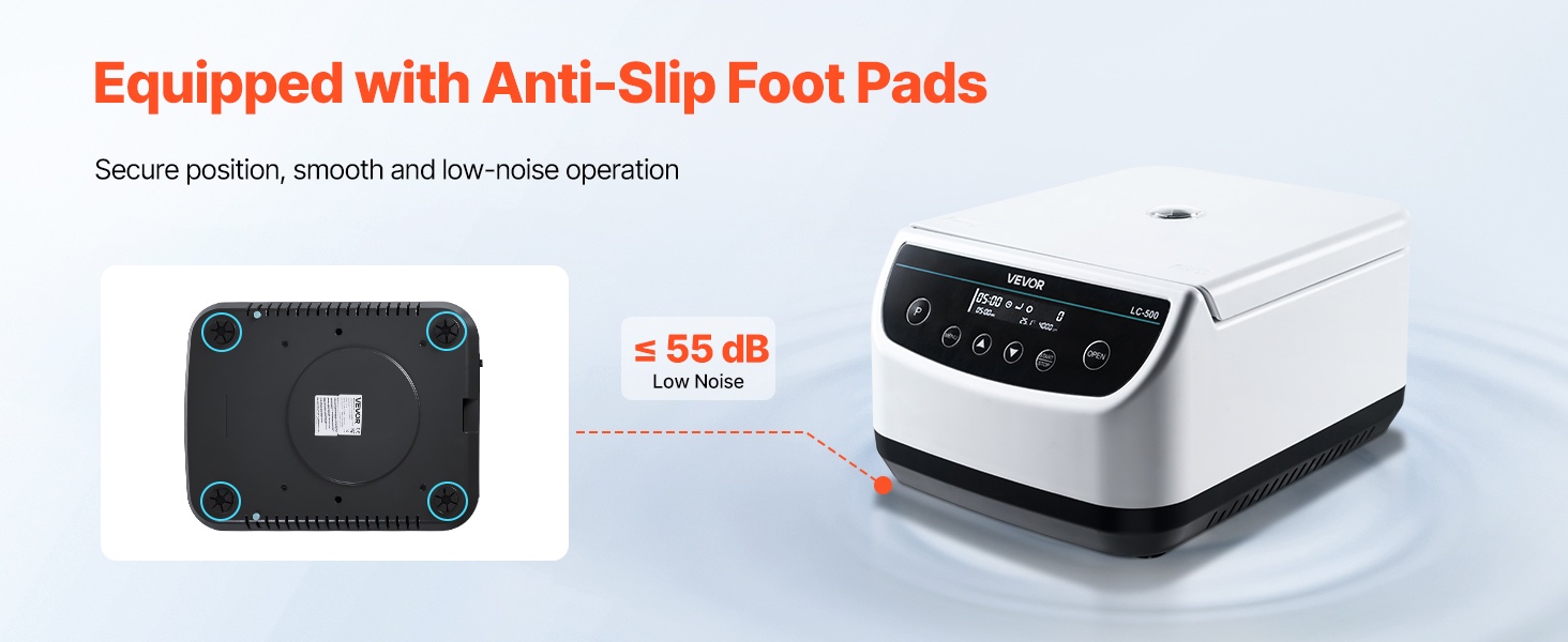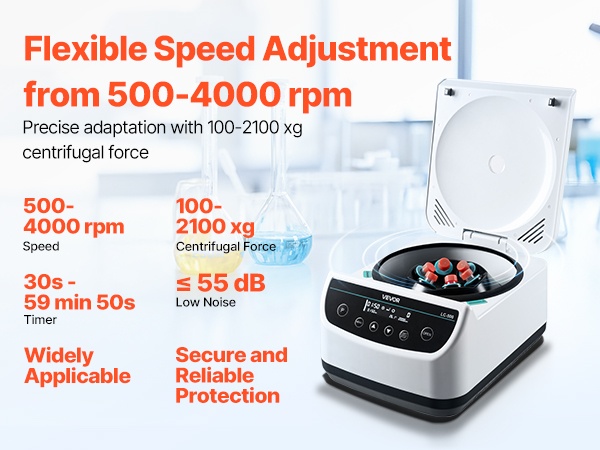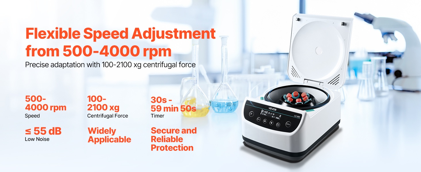 Tämä matalanopeuksinen linkouskone tarjoaa 500-4000 ±5% rpm ja 100-2100xg RCF -arvot. Se soveltuu 6 x 15/50ml linkousputkille tai 6 x 2/5/10ml verinäyteputkille ja sisältää 30s-59min50s ajastimen, ohjelmamuistin, kannen automaattisen pysäytyksen, ylikuumenemissuojan ja liukuestojalat. Sopii eri alojen laboratoriokäyttöön.