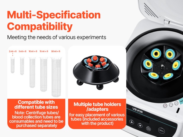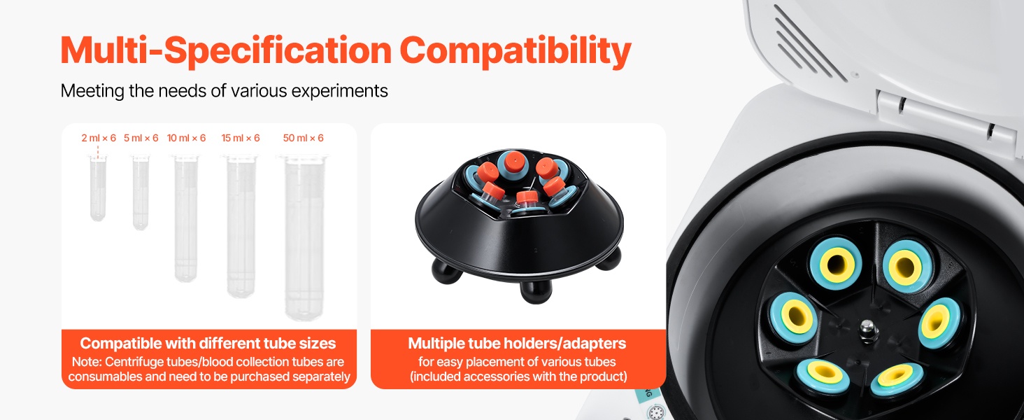 - Rumpukapasiteetti: 15/50ml x 6 (linkousputket) tai 2/5/10ml x 6 (verinäyteputket)