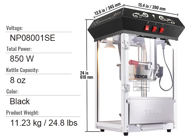 1615W pöytämallinen popcorn-kone, jossa on 16 Oz:n kattila ja karkaistut lasipaneelit, tuo elokuvateatterimaisen kokemuksen kotiin, juhliin ja erilaisiin tilaisuuksiin. Sisäiset LED-valot valaisevat keittoalueen ja valmiin popcornin, joten valmistusta on helppo seurata ja tarjoilu näyttää houkuttelevalta.
