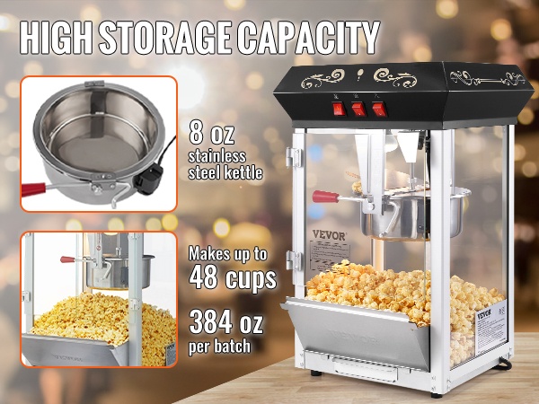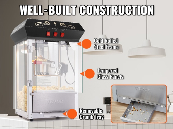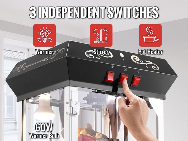 - Lämmitysvastus 155W ja lämpövalo pitävät popcornin lämpimänä tarjoilua varten