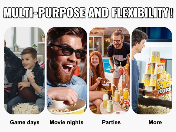 Kone soveltuu hyvin syntymäpäiväjuhliin, kokoontumisiin, urheilutapahtumiin ja muihin tilaisuuksiin, joissa popcorn on toivottu lisä tarjoiluun.