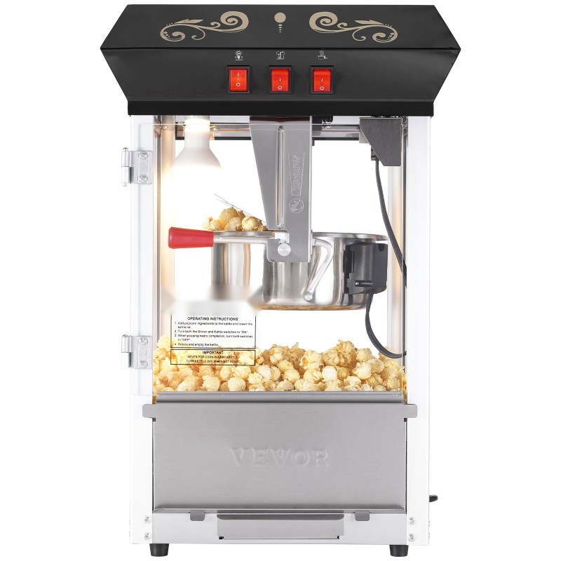 Tämän 8 oz pöytämallisen popcorn-koneen avulla luot helposti elokuvateatterimaisen tunnelman kotiin, juhliin tai pieniin tapahtumiin. Koneen teho on 850W, ja yhdessä erässä valmistuu jopa 48 kupillista popcornia. Karkaistu lasi, sisäiset LED-valot ja ruostumattomasta teräksestä valmistetut elintarvikekelpoiset osat tekevät käytöstä miellyttävää ja puhdistuksesta vaivatonta.