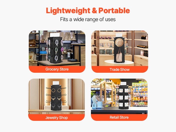 Kevyen rakenteen ansiosta teline on helppo siirtää, puhdistaa ja järjestää uudelleen. Sopii hyvin esimerkiksi päivittäistavarakauppoihin, koruliikkeisiin ja muihin myymäläympäristöihin, joissa esillepanoa muutetaan usein.