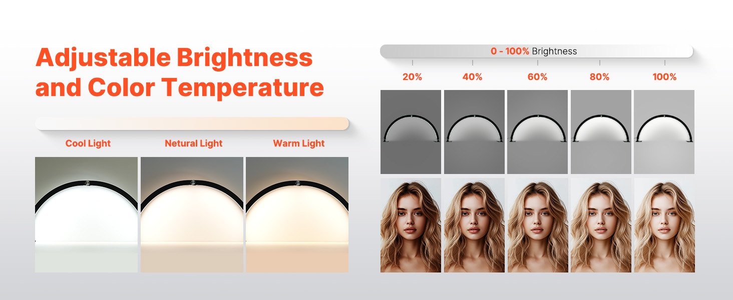 Valaisimessa on tarkasti säädettävä kirkkaus ja värilämpötila 3000K–6000K -alueella. Voit valita pehmeämmän, lämpimän valon tai kirkkaan, viileän valon juuri työn ja tilan mukaan, mikä helpottaa värien arviointia ja yksityiskohtien näkemistä.
