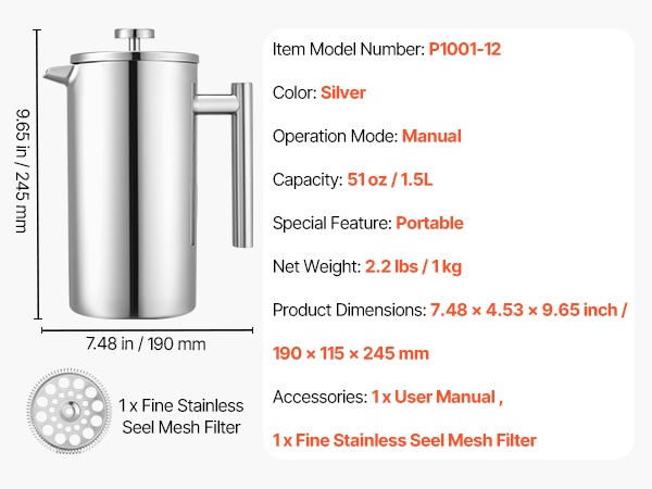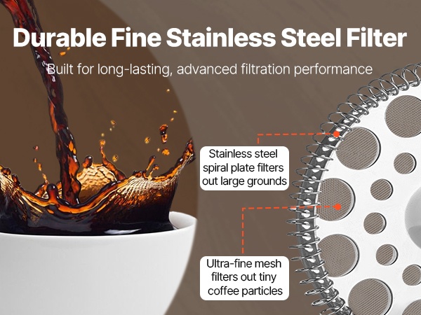 Tiheä, ruostumattomasta teräksestä valmistettu verkkosuodatin pysäyttää tehokkaasti kahvijauheen ja tuottaa puhdasta, pehmeää kahvia. Ruoan kanssa käytettäväksi soveltuva 304-ruostumaton teräs on ruostumaton, korroosionkestävä ja helppo puhdistaa, jotta kahvi maistuu tuoreelta jokaisella käyttökerralla.