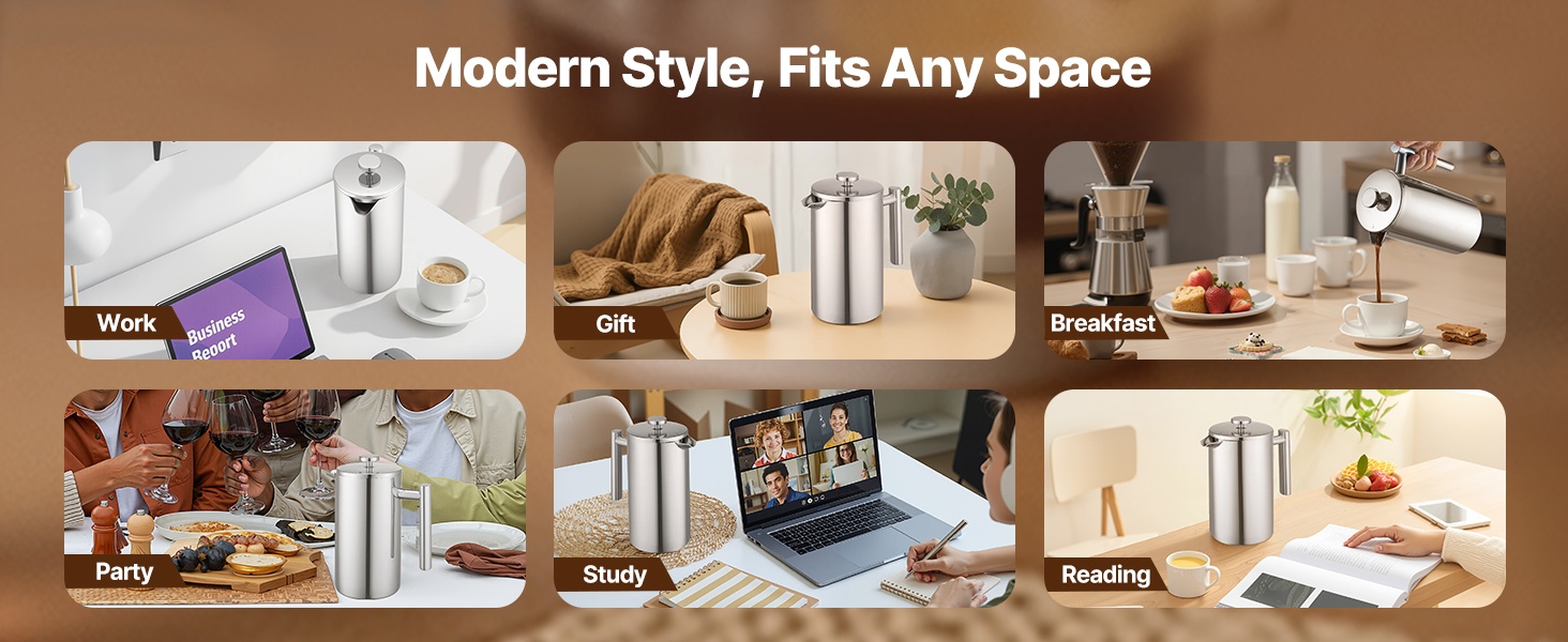 Tämä kaksiseinäinen, ruostumattomasta teräksestä valmistettu pressopannu on suunniteltu kestämään käyttöä ja vastustamaan ruostetta. Tyhjiöeristys auttaa pitämään kahvin kuumana ja aromaattisena, ja tippumista ehkäisevä nokka tekee kaatamisesta tasaista ja siistiä.