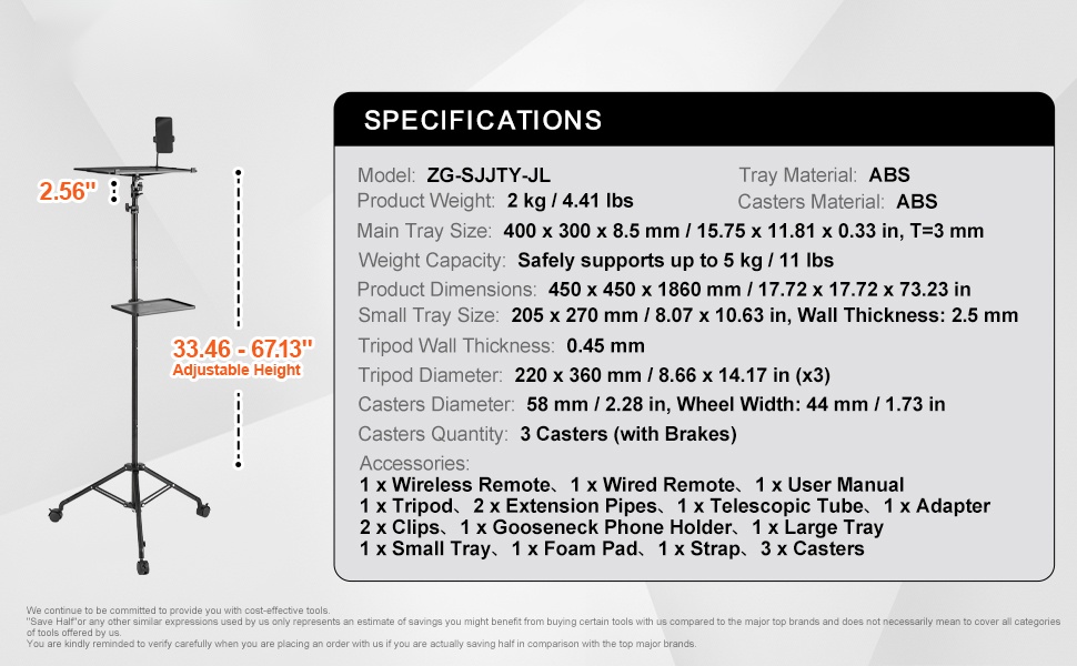 Säädettävä projektoriteline 26.97–62.99 tuumaa, suuri 300×400 mm tarjotin, joustava hanhenkaula puhelinpidike, tukeva kolmijalka, 5 kg kantavuus, kevyt kuljettaa.