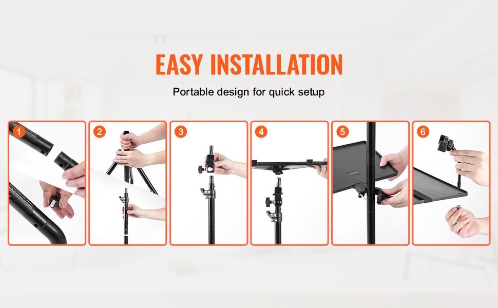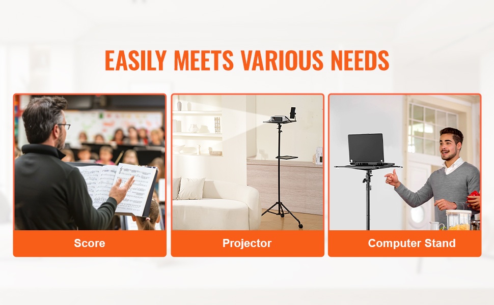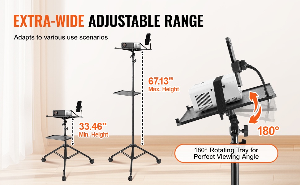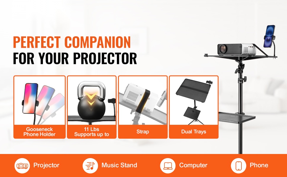 Monikäyttöinen projektoriteline, jossa on suuri tarjotin, joustava hanhenkaulainen puhelinpidike ja tukeva kolmijalkarunko. Soveltuu projektoreille, kannettaville tietokoneille ja muille laitteille kotiin, toimistoon, ulkoilmaelokuviin, lavalle ja studioon.