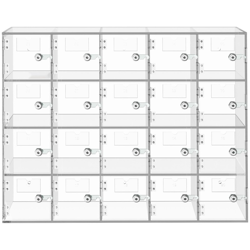 Puhelinsäilytyskaappi läpinäkyvä akryyli 20 lokeroa lukoilla ja avaimilla seinälle asennettava